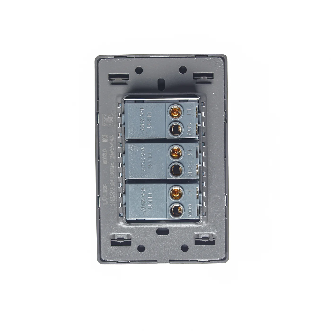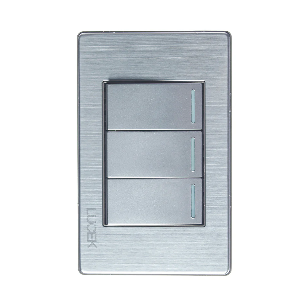 Placa metálica plateada de 3 módulos con tres apagadores sencillos de 1 modulo plateado. 127-250V, 16 A. Acero inoxidable. Fácil de instalar. Terminales en punta de plata. Excelente calidad. La tecla es más ancha lo cual nos proporciona una vista más estética. Garantizada por 5 años.