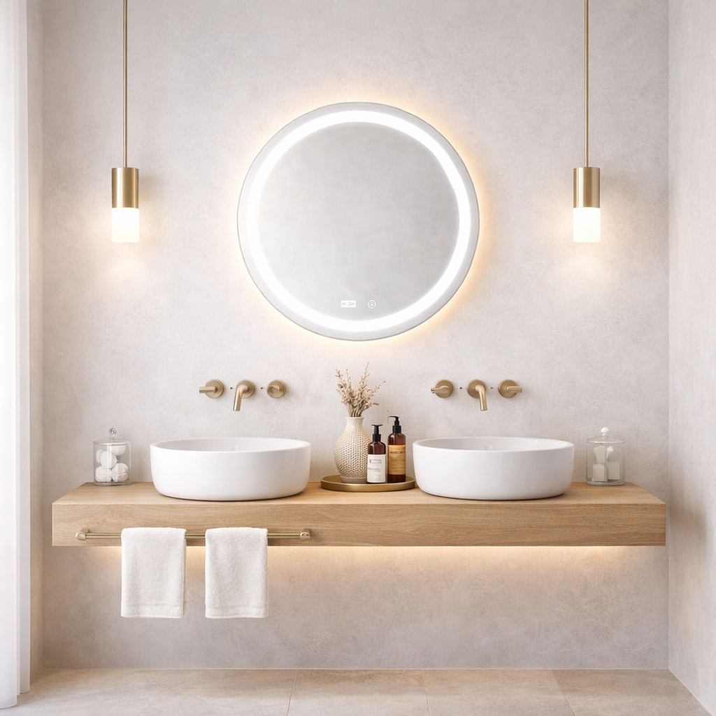 Espejo redondo de 45 cm de diámetro: un tamaño práctico para baños pequeños o medianos, vestidores o zonas de tocador. Su forma simple permite integrarse fácilmente en distintos estilos decorativos, desde minimalista hasta clásico.