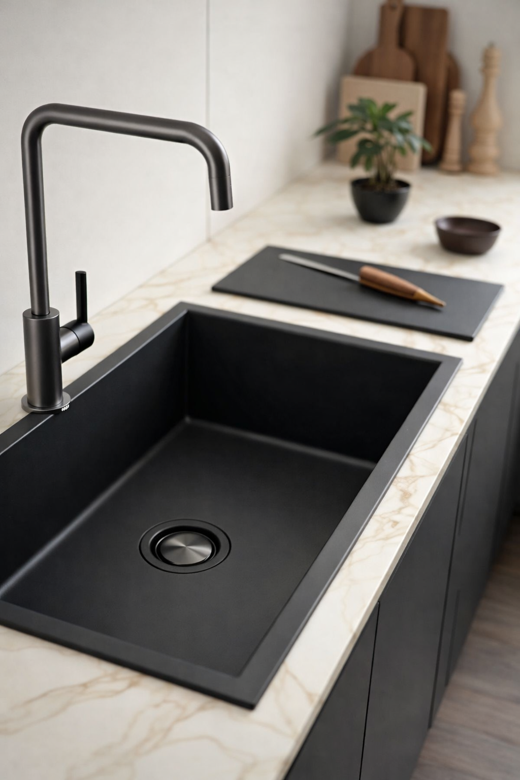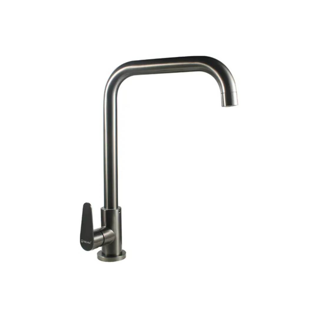 Llave individual con acabado gris, ideal para fregaderos que buscan un estilo industrial o moderno. Fabricada en materiales resistentes, diseñada para uso continuo en cocina o áreas de lavado.