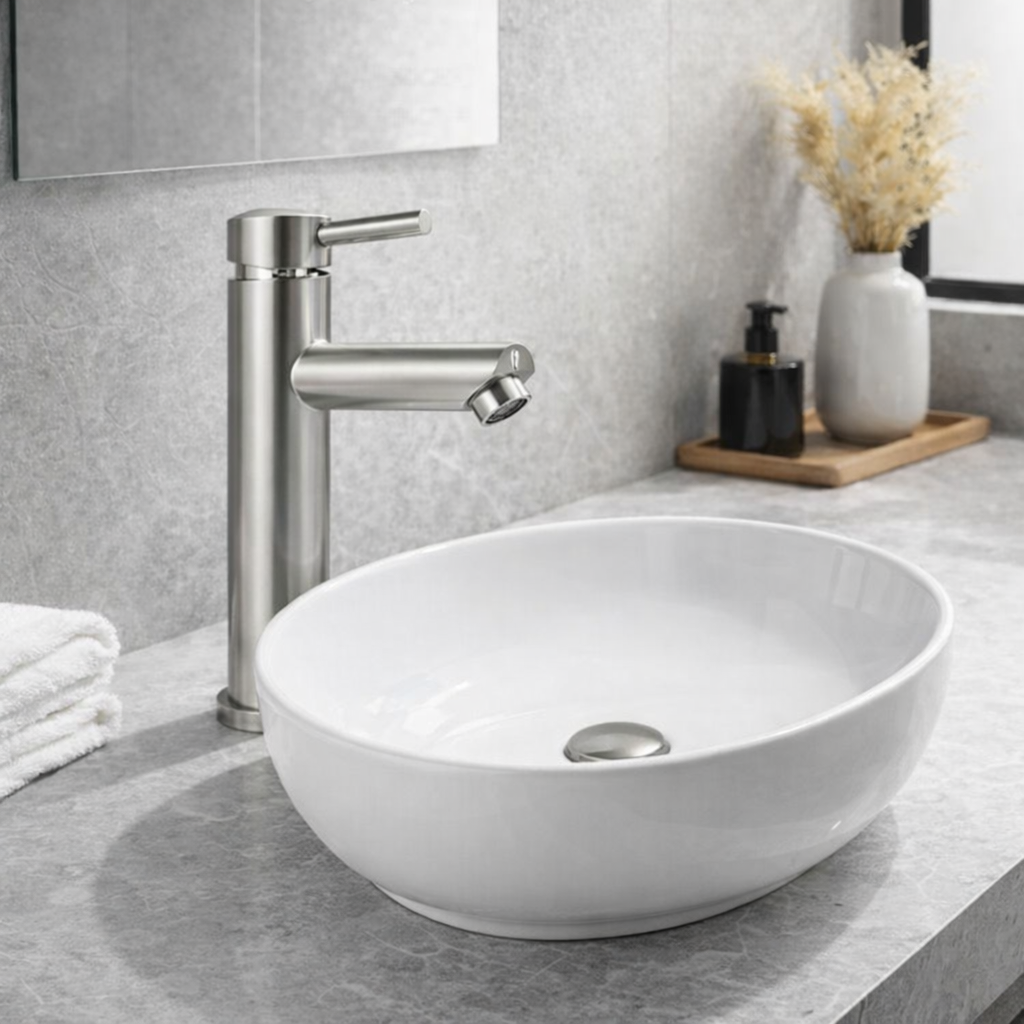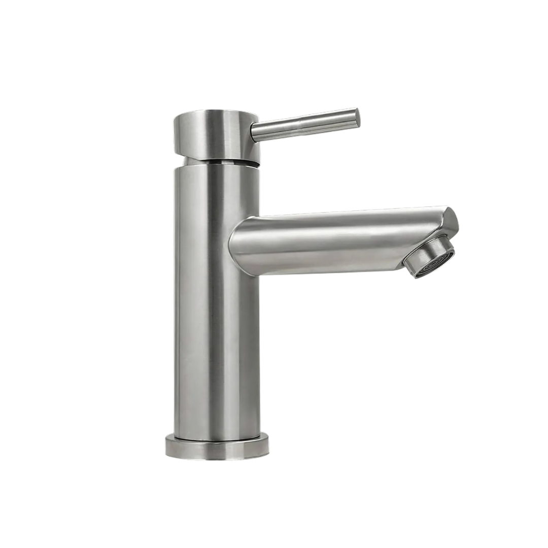 Monomando para lavabo con acabado satinado, resistente y elegante. Perfecto para baños residenciales que buscan un diseño moderno y fácil mantenimiento. Su acabado ayuda a ocultar huellas y manchas.